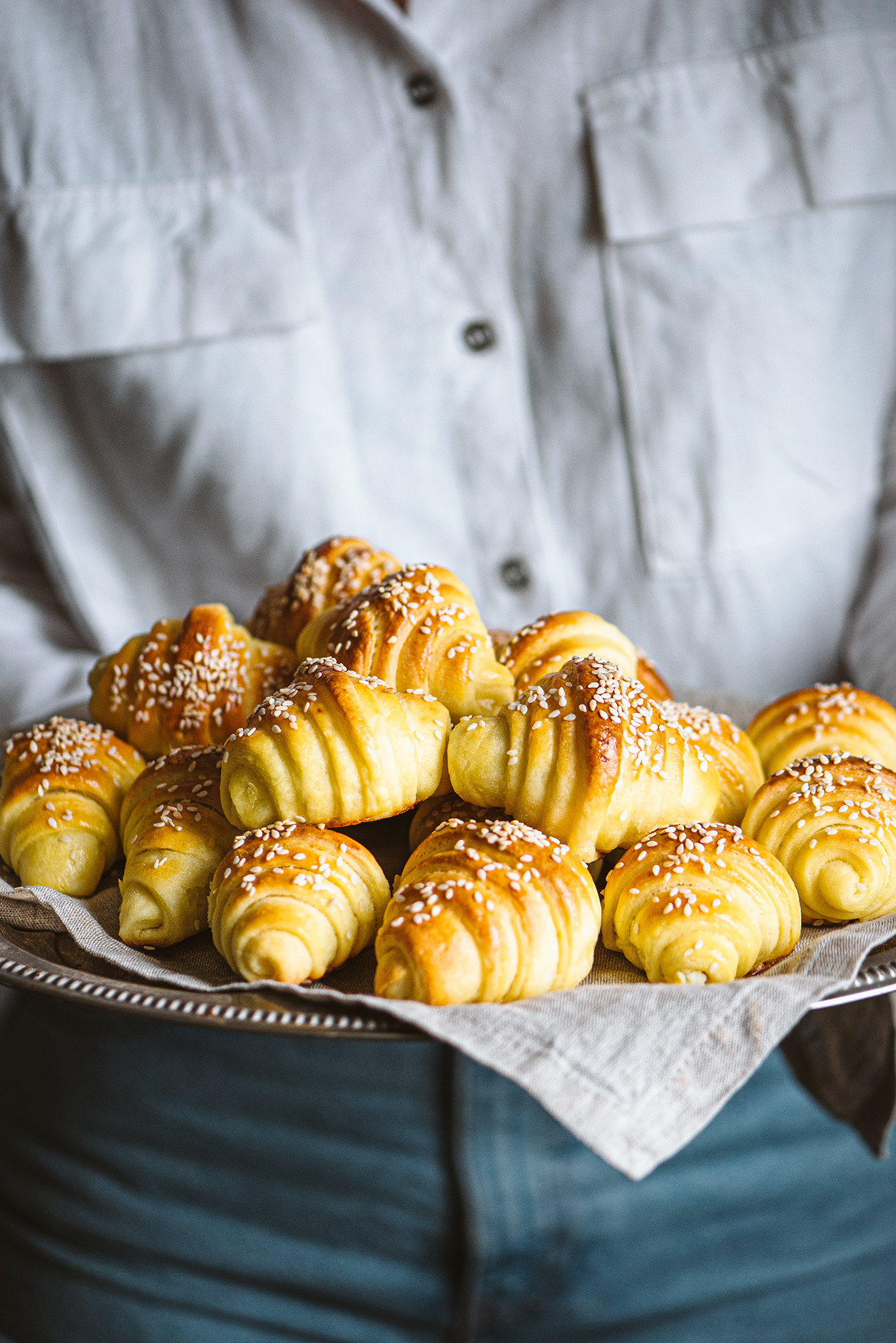 Kiflice premazati ulupanim jajetom, posuti susamom i ostaviti da nadođu još 30-ak minuta.